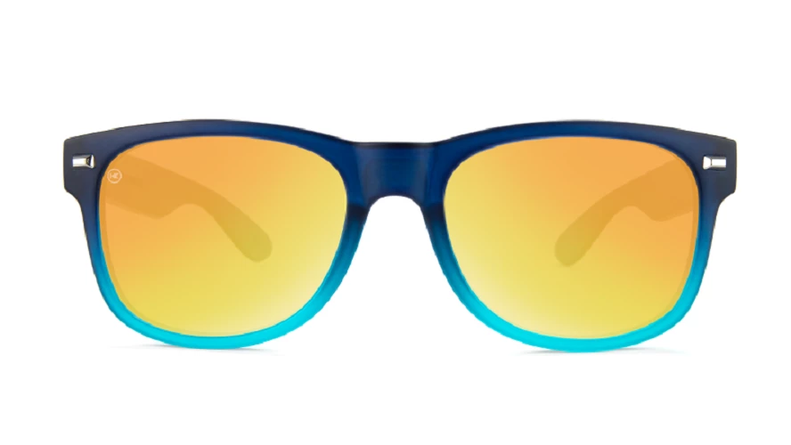 For this colourway, they have given the injection-molded frames a frosted navy fade finish and silver detailing that ooze evening cool. The yellow mirrored sunset lenses complement the look and add a refreshing pop of color, guaranteed to turn heads.