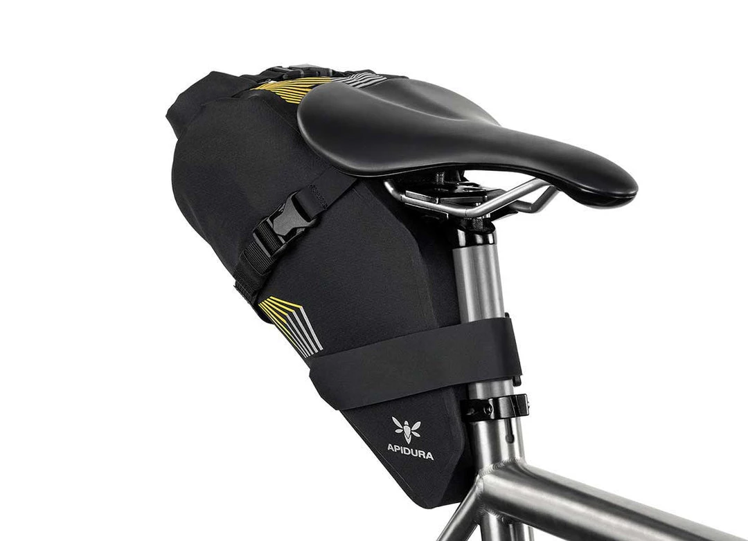 Constructed from an ultralight, waterproof laminate developed for Apidura. The seat bag weighs less than 210g and securely fastens with a sturdy three-point attachment system. It’s designed to fit ergonomically under the saddle, minimising sway and reducing drag.
