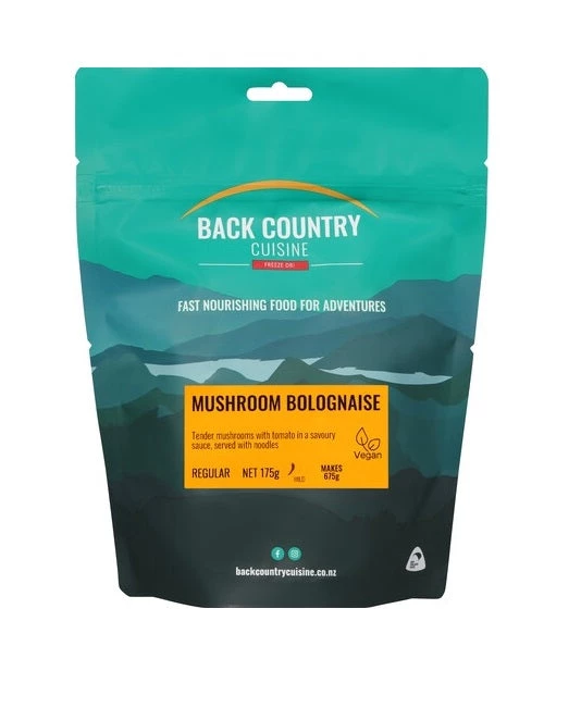 Back Country Cuisine Mushrooms Bolognaise is a vegan meal with tomatoes in a savory sauce and served with noodles