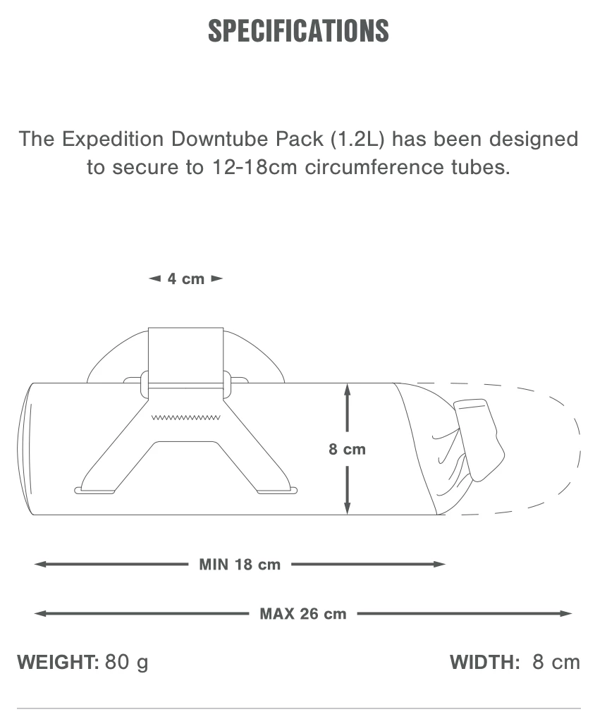 Please note: we do not recommend mounting the Expedition Downtube Pack on tubes with a circumference of less than 9.5cm, such as seat stays and forks.