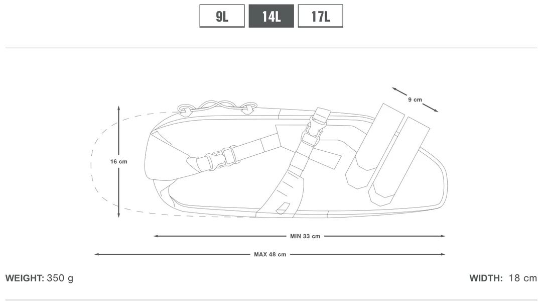 - 14L: H 16cm x W 18cm x L 33 – 48cm. Weight: 350g