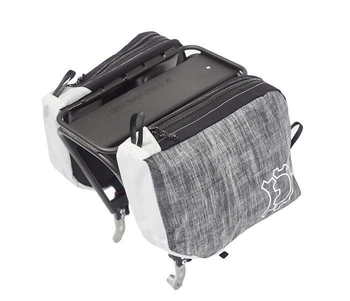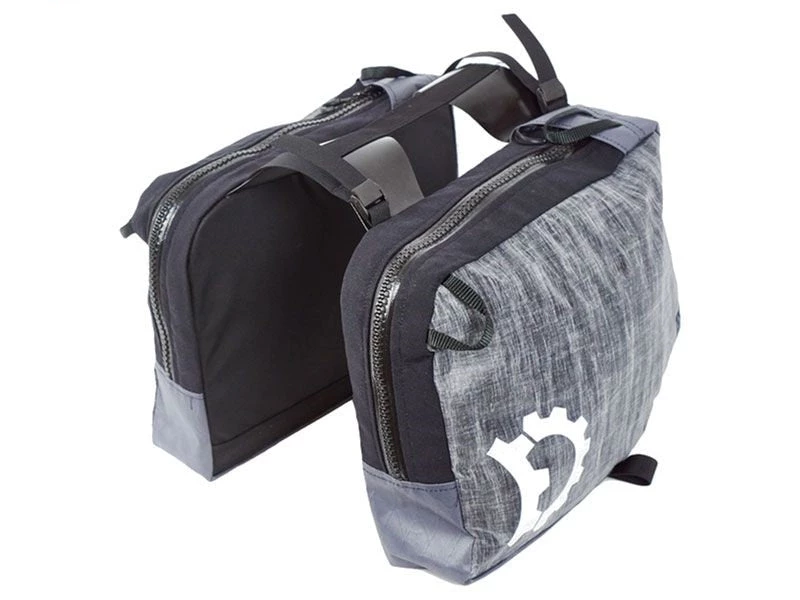 To keep the mounting as simple as possible, the bags are joined and can only be run as a pair. The fixed width is spaced for Old Man Mountain phat Sherpa racks, for narrower rack decks a set of cam buckles takes up the slack, or simply let the bags ride lower along the sides. Tension the system with straps and cam buckles on either side.