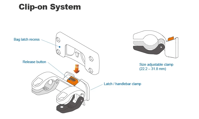 Large compartment, waterproof external zippered pocket, Shoulder strap, Reflective trim, Size adjustable clamp fits most handlebars (22.2 – 31.8 mm).