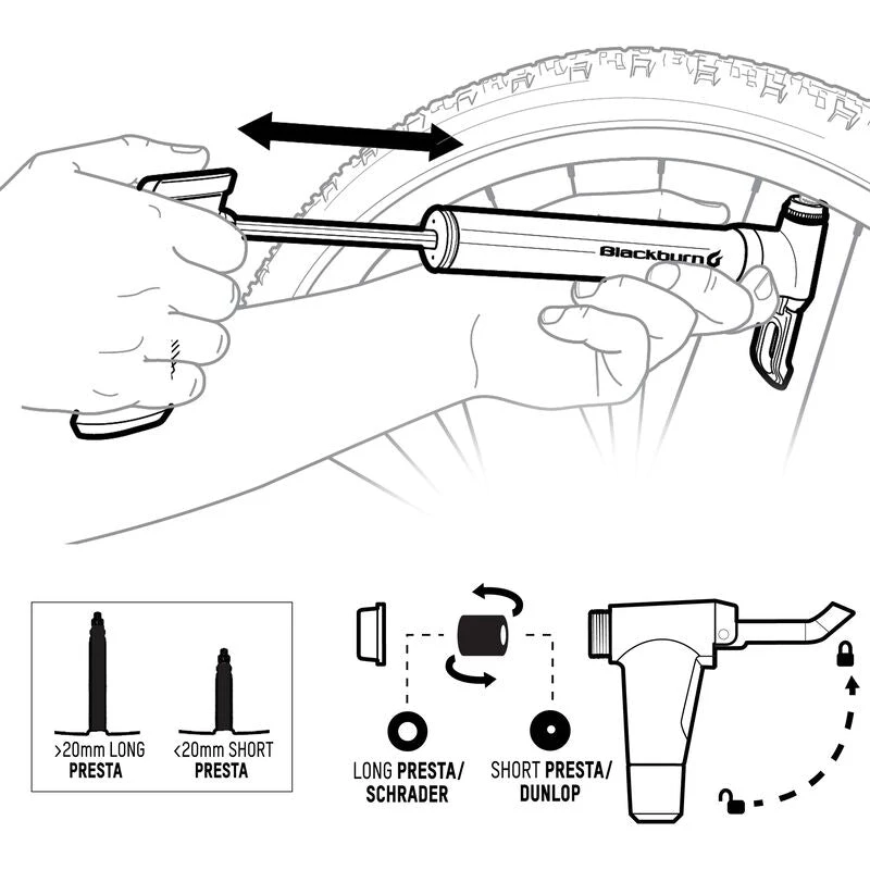 - Anyvalveâ„¢ Pump Head: works great on Presta, Schrader and Dunlop valves. No leaking, no fuss, clean and simple.