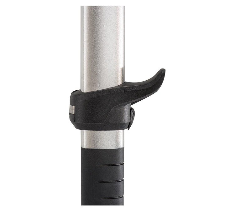 The Venom’s stainless steel head features a fully interchangeable pick design that is compatible with any Black Diamond pick. The integrated grip and asymmetrical angled shaft provide security and easy handling when swinging it like an ice tool, and a sliding Flick-Lock pommel offers an adjustable second grip for choking up on steep snow.