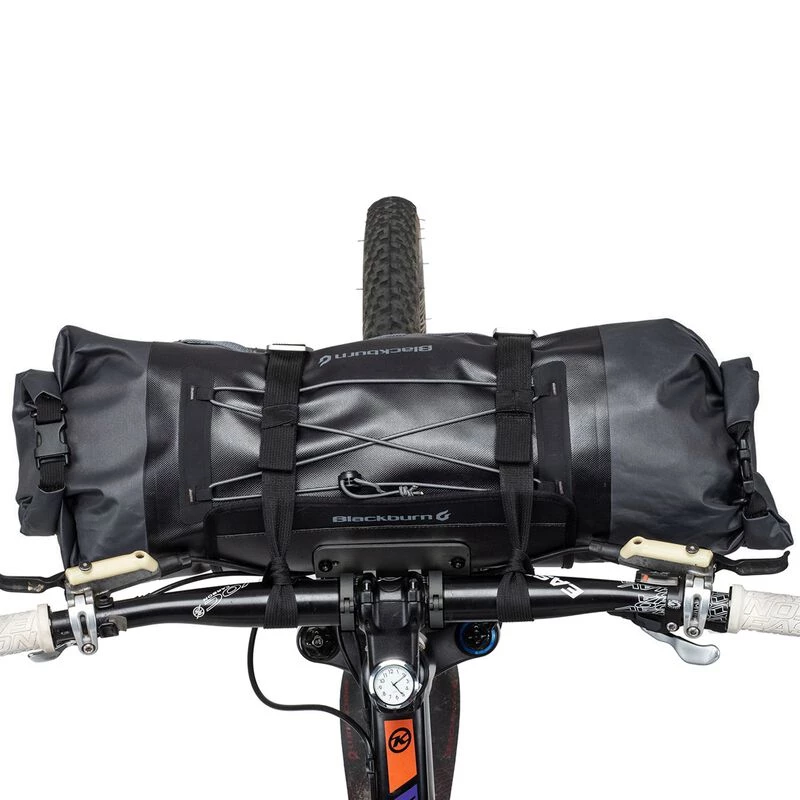 The Outpost Elite Handlebar Roll is an epic expedition-worthy harness and dry bag system. The Handlebar Roll is a system in two parts: Part 1 is a fixed mount with an angle-adjusting, alloy face plate that attaches with a harness to snug your cargo up under your handlebars. Part 2 is a removable and waterproof dry bag. Intended to work with handlebar diameters 25.4-35mm, the two-part design allows for ease of loading and evenly distributes weight — critical features for loading your rig in the wild. The dry bag also features molle straps and elastic cordage to affix external cargo like your camp mug, topo map, or rain gear.