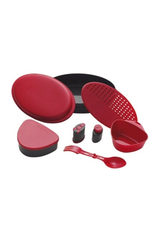 Two deep plates, a spice jar with three compartments, a small container that can be used for oil or washing-up liquid, storage container with tight-fitting lid, an outdoor cup, folding spork and an all-in-one cutting board, colander, grater and knife.