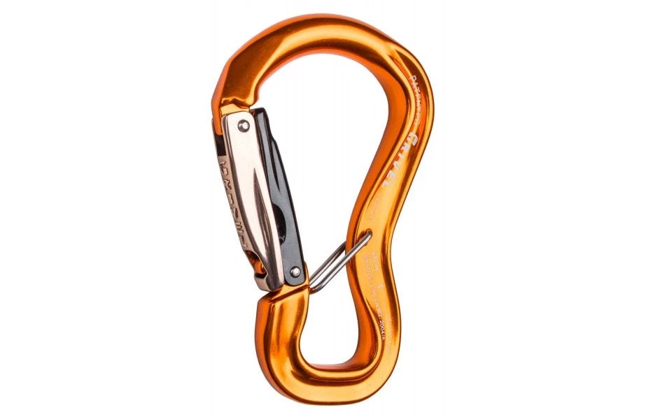 Grivel has designed a totally new carabiner where a simple second wire gate isolates the belay loop and keeps the proper orientation even with the carabiner door open.