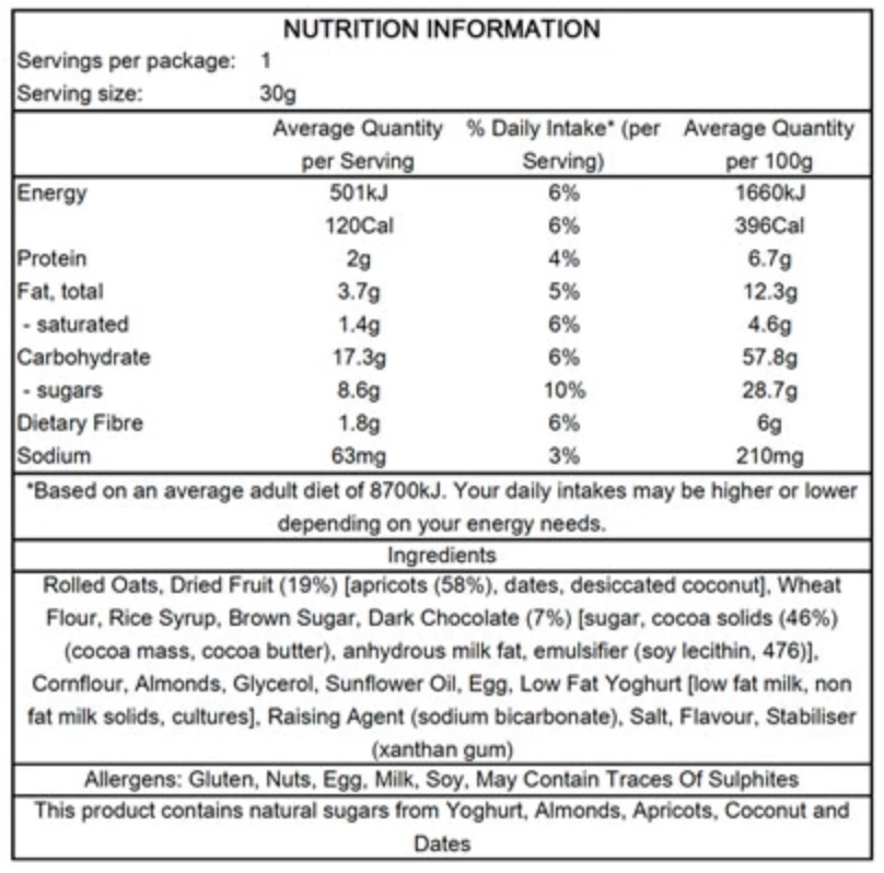 - Natural sugars from apricots, dates, coconut, almonds and natural yoghurt