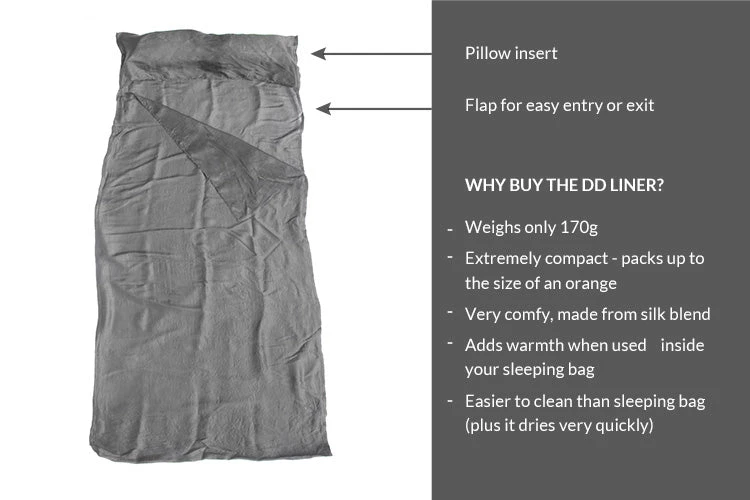 The DD Hammocks’ sleeping bag liner is probably the lightest and most compact sleeper you will find! Made from a comfortable silk blend and weighing just 170g, it packs into the small pouch included.