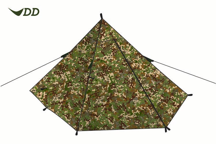 The DD Pyramid Tent – MC is simple to pitch, erected with just one Hiking Pole (not included) or even suspended from a ridge-line between trees. The DD Pyramid Tent-MC is designed to be pitched over the top of the DD SuperLight Pyramid Mesh Tent (sold separately) to create a 2-layer tipi style set-up, but can be used by itself for a strong and camouflaged shelter from the rain.