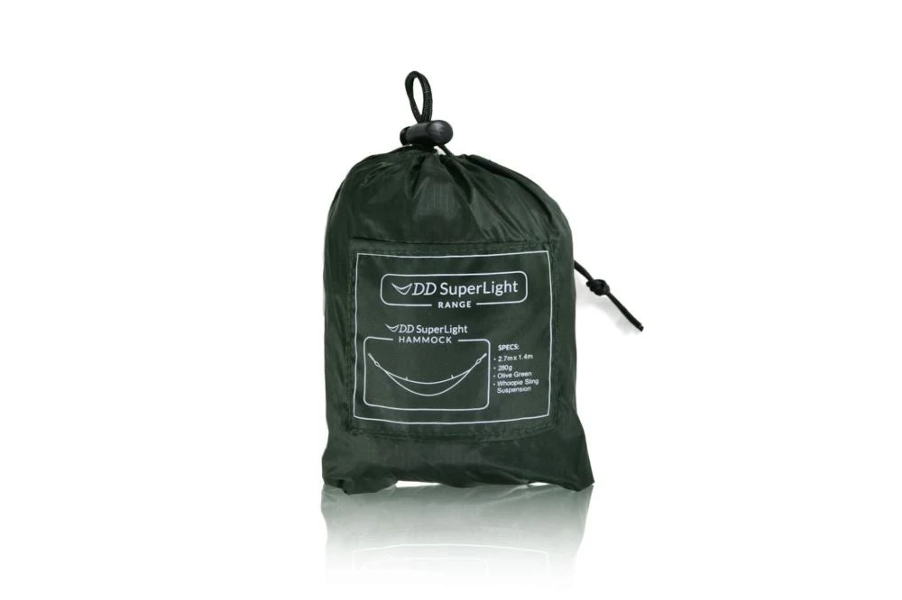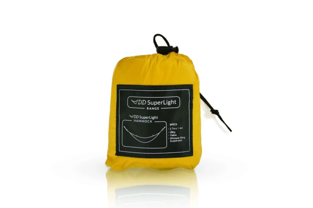 The New DD SuperLight Hammock: weighing just 270g (inc all suspension, bag etc.) with an incredibly small pack size of just 14cm x 9cm x 7cm – this Hammock can literally be taken everywhere!