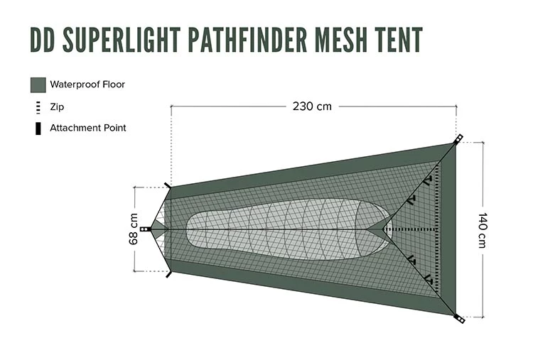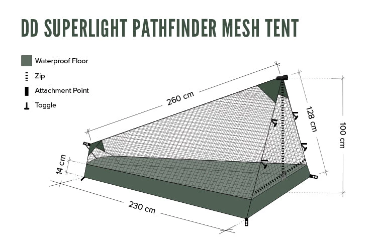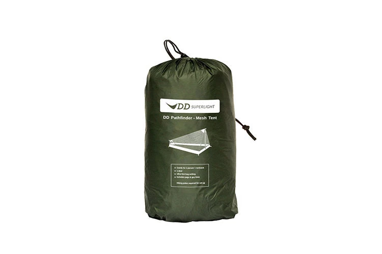 Frameless and single layered, the DD Superlight Pathfinder Mesh Tent is designed to be as light as possible and set up in no time: simply prop up the foot end with the spreader bar provided, and the top end with either 1 or 2 hiking poles.
