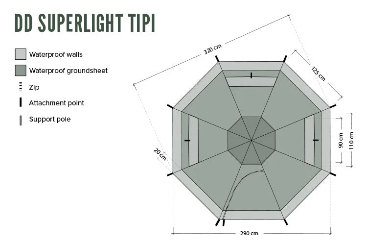 DD Hammocks first group tent with ample space for 3 adults or a (young) family of 4, including the associated gear, the SuperLight Tipi is a practical, lightweight and high performing tent fitting easily into most packs.