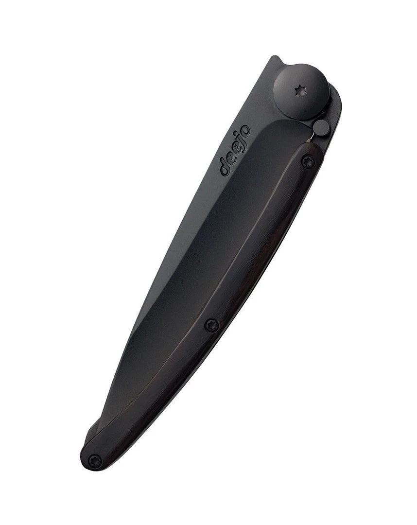 Nuances all in black, the deep black of ebony wood subtly blends with the matte black reflections of titanium. Ebony wood, visually appreciated for its deep blacks, possesses the particularity of being virtually insensitive to humidity. This species of wood is thus the densest, the most resistant, and the most precious, ideal for this magnificent piece of cutlery.