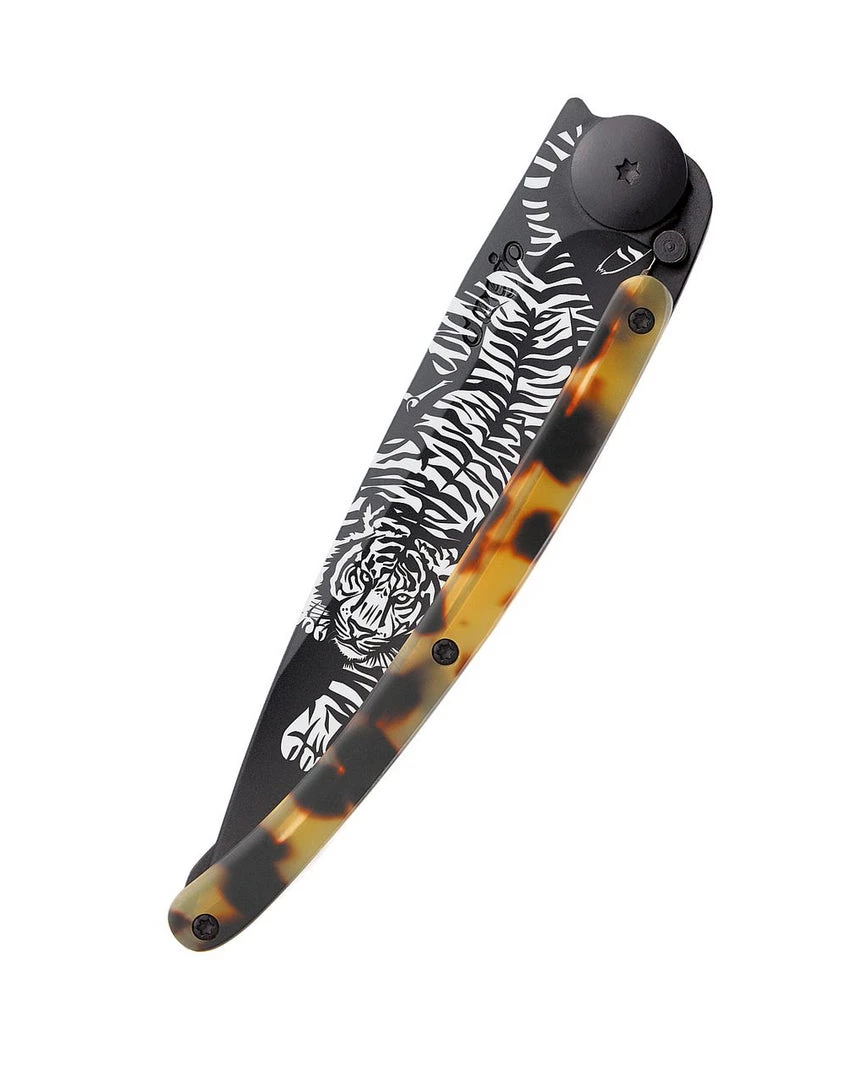 The largest terrestrial wildcat to decorate the most elegant knives. The tortoiseshell that adorns our Deejo knives is composed of a cellulose acetate composite mainly used by the eyewear industry. For decades, this synthetic material has replaced real tortoiseshell. Sturdy and luminous, this material comes in the many nuances that nature counts as species, a material of choice to emphasize the elegance of our knives.