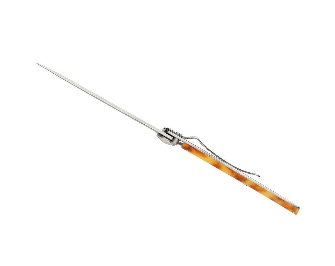 A Deejo that gives you wings. Embark in the footsteps of Mermoz and St Exupéry in the wake of airmail, towards Africa or the Andes. The tortoiseshell that adorns our Deejo knives is composed of a cellulose acetate composite mainly used by the eyewear industry. For decades, this synthetic material has replaced real tortoiseshell. Sturdy and luminous, this material comes in the many nuances that nature counts as species, a material of choice to emphasize the elegance of our knives.