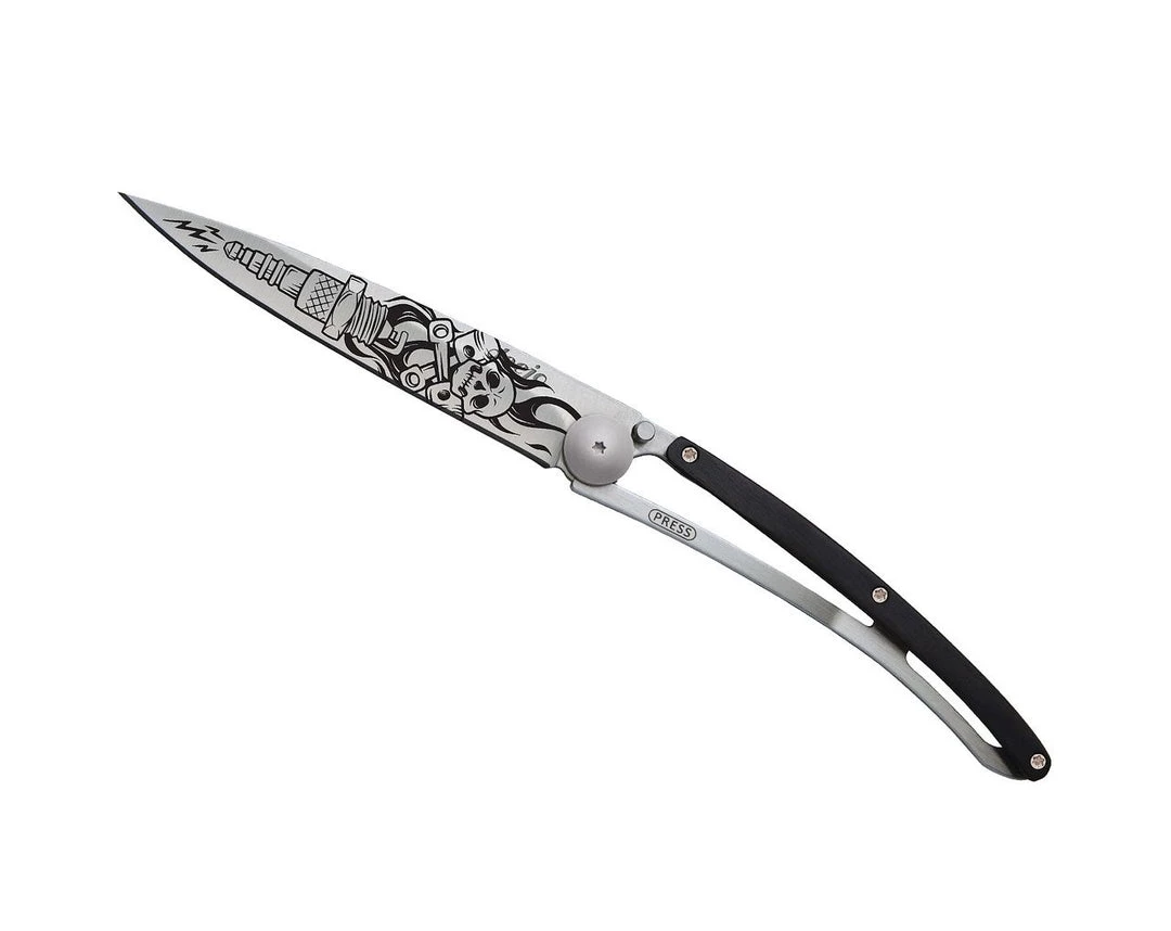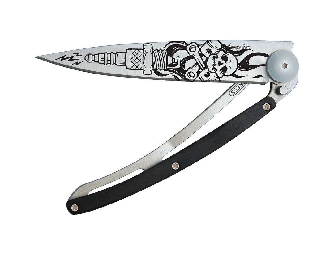 Bikers will find themselves in this motif originally inspired for them, but not only. Ride or die. The ebony wood plate complements the elegant shaping of this thin blade, made popular by its exceptional cutting capacities and feather-light weight. Ebony wood, visually appreciated for its deep blacks, possesses the particularity of being virtually insensitive to humidity. This species of wood is thus the densest, the most resistant, and the most precious, ideal for this magnificent piece of cutlery.