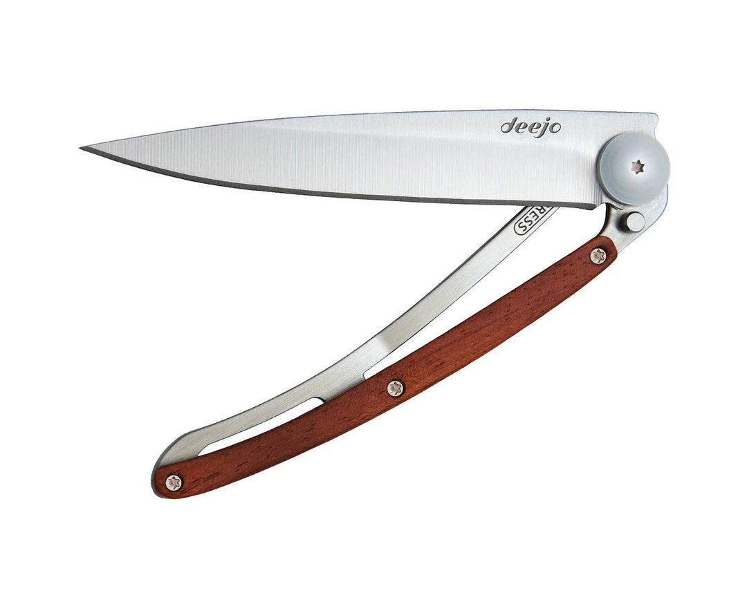 A detailed finish in natural, delicately veined wood for this ultra-light gem of a knife. Weighing only 37 grams, carry it wherever you go for the unmatched pleasure of perfect cutting. Coralwood (or Padauk) is an abundant wood traditionally used in cutlery for its exquisite red and amber highlights (the reason for its name), its robustness, and its exceptional resistance to humidity. Coralwood exquisitely highlights the elegance of a Deejo knife.