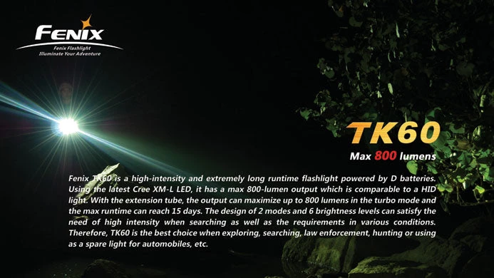 The TK60 800-Lumens Flashlight (Black) from Fenix Flashlight is a waterproof flashlight with runtimes that vary from 4.25 to 400 hours, depending on the output used. This supremely bright light is made from aircraft-grade aluminum in a premium type III hard anodized anti-abrasive finish. Six output levels in two modes can be accessed by the dual side buttons. There are 4 constant light levels from 10 to 800 lumens, and 2 flashing modes–a strobe mode at 800 lumens, and an SOS signal at 111 lumens.