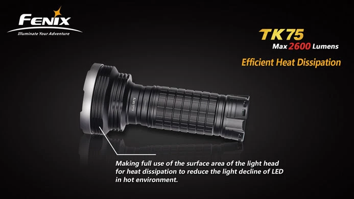 With the Fenix TK75, four 18650 rechargeable cells are stunningly transformed into 2900 lumen max output. Throwing 690m with an 80 degree plus beam angle lets the TK75 light up extended terrain.