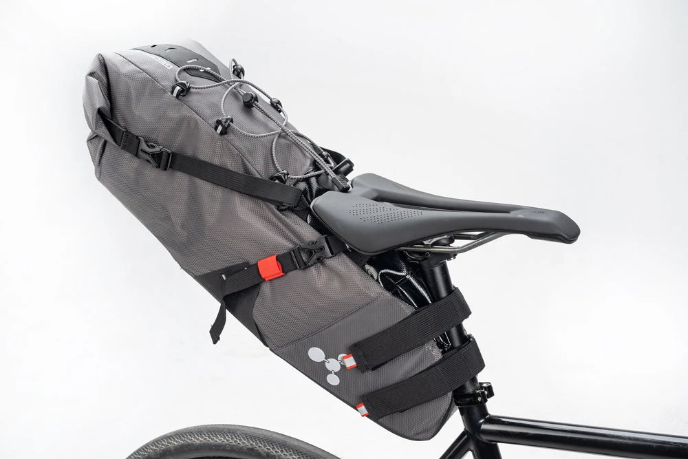 Hypalon inserts: This elastomer is highly resistant to temperature changes (between -31 °F and 284 °F / -35 °C and 140 °C), traction and tearing; it is resistant to acids, fuels and oils; and it is also fireproof. Its high load capacity (90 kg per square centimeter) and low weight make it the perfect material for reinforcing key areas of Geosmina Bikepacking bags.