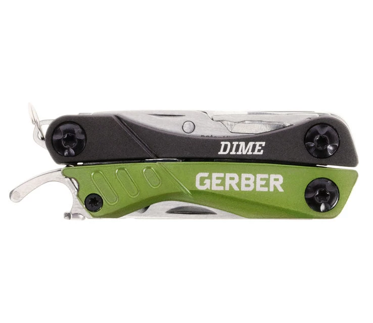 Gerber took the standard keychain multi-tool and made it better. In addition to stainless steel pliers, wire cutters, a fine edge blade, spring-loaded scissors, flathead screwdriver, crosshead driver, tweezers and file, the Dime includes a unique blade designed to safely cut and score plastic packaging and a bottle opener that is exposed even when the tool is closed.