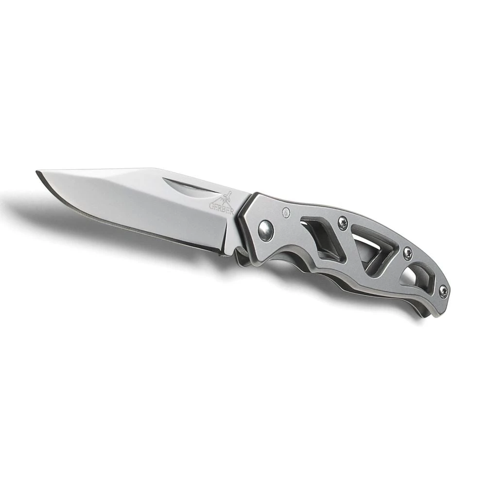 The stainless Paraframe Mini Fine Edge Folding Knife by Gerber features a clip point, fine edge blade forged from High carbon stainless steel. The blade is attached to an open paraframe stainless steel handle with a one-handed opening system and pocket clip.