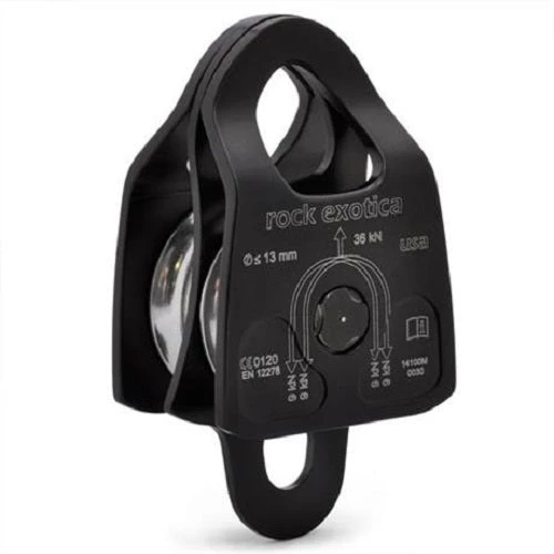 Rock Exotica prusik-minding Rescue Pulley Double for ropes up to 13 mm in diameter (36 kN) – the bigger brother to the Rock Exotica Mini Machined Pulleys (P21 and P21 D).