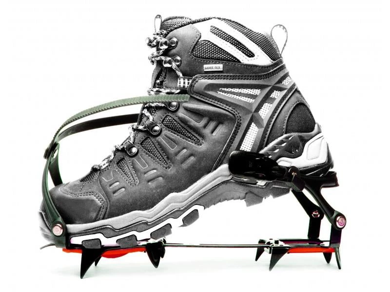 Although it resembles the shape of ice climbing crampons, this Pro version is designed for alpine travel under extreme weather conditions, not for technical ice climbing.