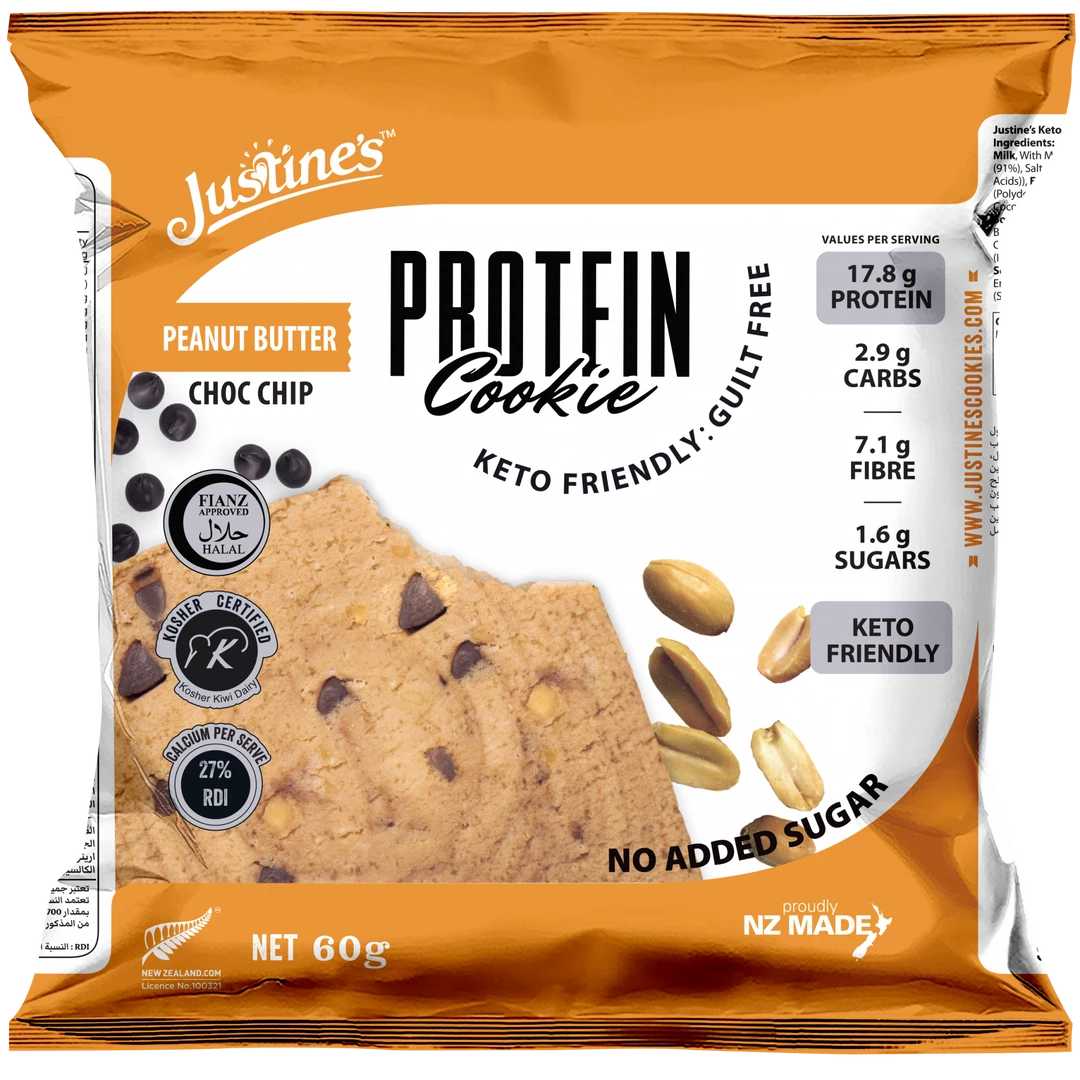Justine’s protein blend (54%) (calcium caseinate (from milk, with monoglycerides), peanut butter (20%) (in which peanuts (91%), salt, soybean oil, emulsifier (mono and diglycerides of fatty acids)), egg, almonds), humectant (vegetable glycerol), bulking agent (polydextrose), sweetener (erythritol), vegetable oil spread (palm oil, coconut oil, water, salt, emulsifier (mono and diglycerides of fatty acids, soy lecithin), antioxidant (mixed tocopherols concentrate), natural butter flavour, acid (citric acid), colour (carotene)), no added sugar dark compound choc-type chips (6%) (sweetener (erythritol), vegetable fat (palm kernel oil (contains emulsifier (sorbitan tristearate))), cocoa solids, soy protein isolate, emulsifier (soy lecithin), natural vanilla flavour), emulsifier (soy lecithin), baking powder (contains raising agents (sodium acid pyrophosphate, sodium bicarbonate)), sea salt.