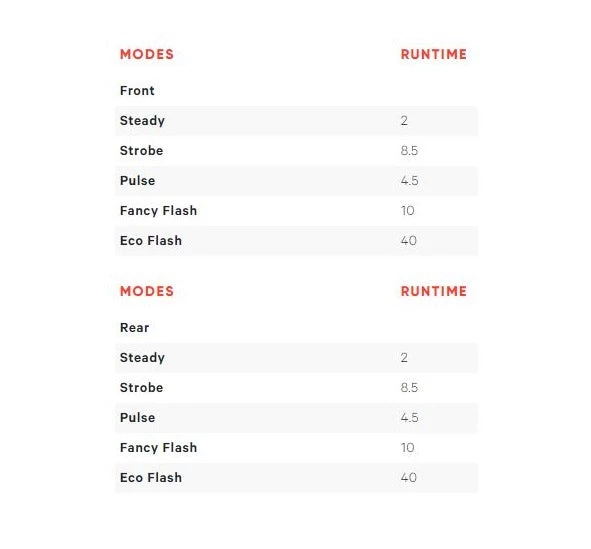 The Plus front light pumps out an impressive 40 lumens of light and has 5 different light modes. It’ll keep you lit up all night long, with run times of up to 40 hours on eco flash. Efficient Chip on Board (COB) LEDs are designed to provide maximum brightness level for up to 90% of the battery burn time for each mode.