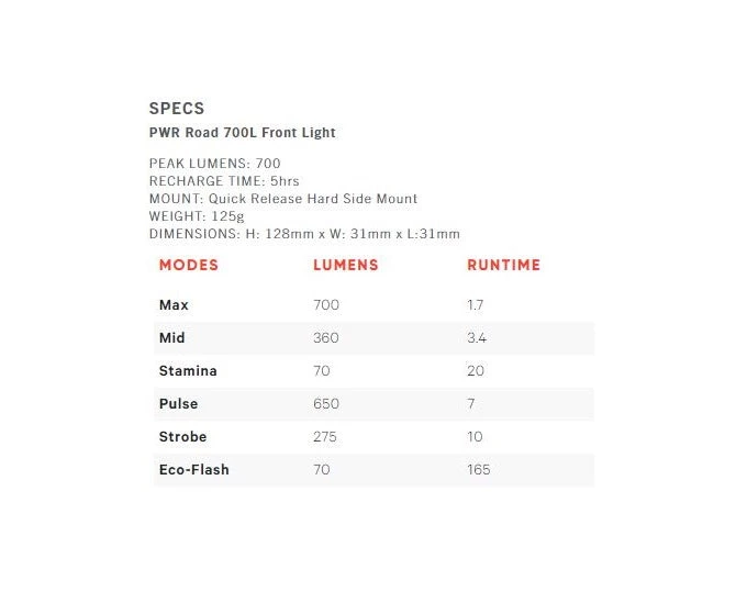 PWR Road outputs a max 700 lumens, and can run for up to 195 hours on Eco Flash Mode. Its elliptical beam gives broader, bright road coverage. It comes with 6 pre-programmed modes, and you can programme the light to suit your needs with Modemaker. You can control brightness, adjust runtimes and add new light modes.