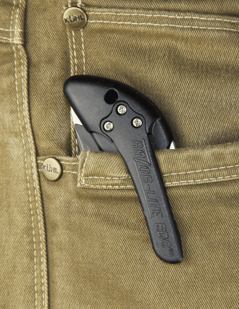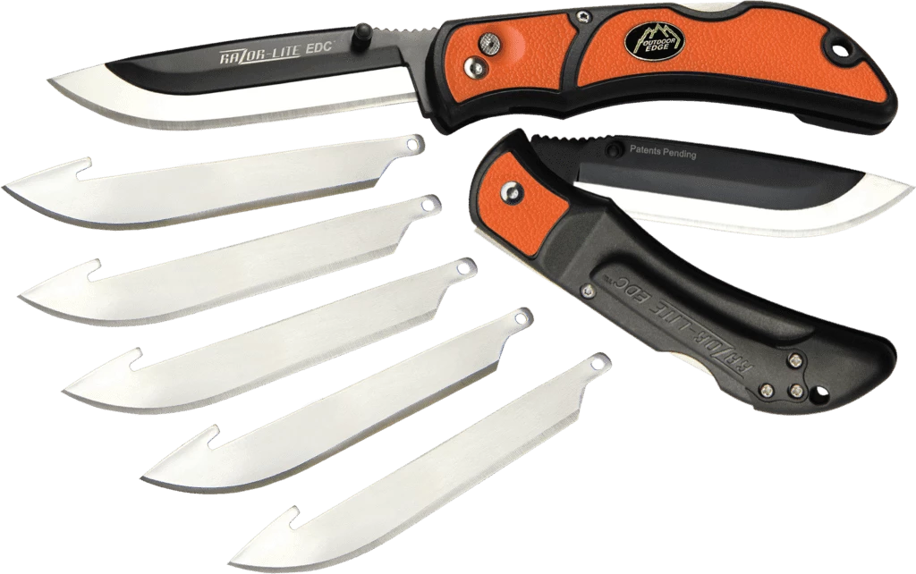 The 7.6cm Japanese 420J2 stainless razor-blades are precisely heat treated and hand finished shaving-sharp. The double molded Grivory® handle features rubberized TPR inserts for a non-slip grip, even when wet. The double sided thumb stud allows easy, one-hand opening and the replaceable pocket clip contours with the handle so it feels like an integral part of the grip. The Razor-Lite EDC is available with orange or gray handles and comes complete with six replacement blades.
