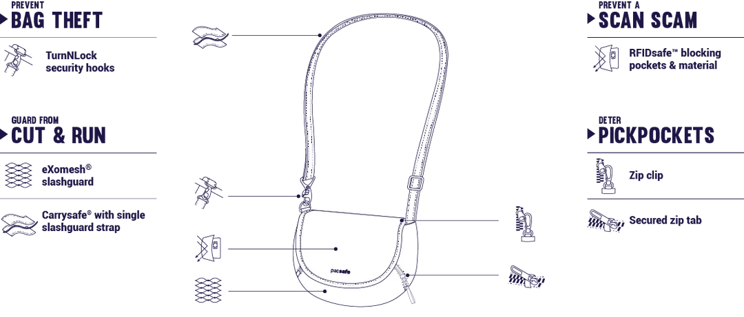 Cut-resistant anchor strap secures around a fixed object to protect your bag