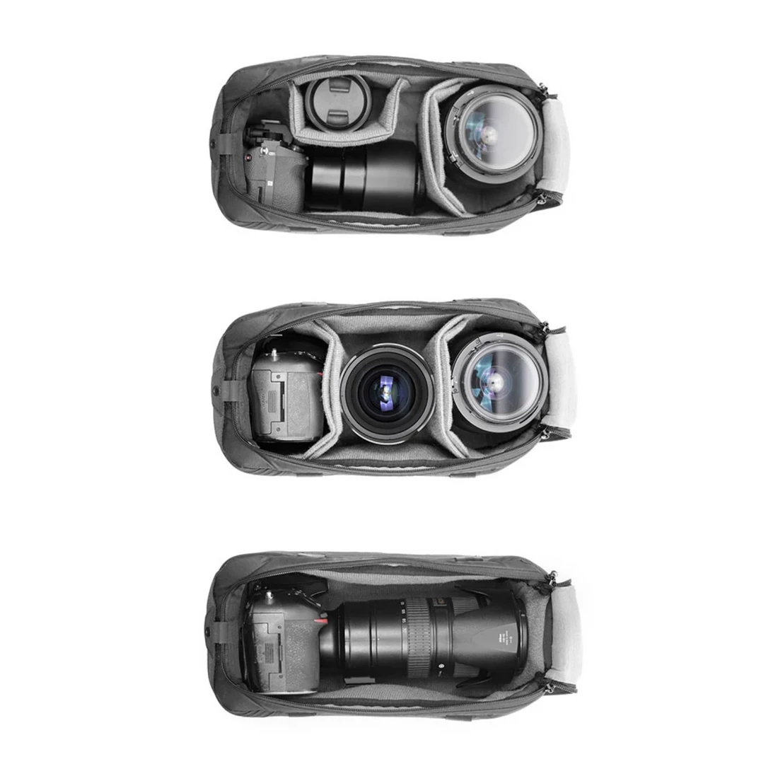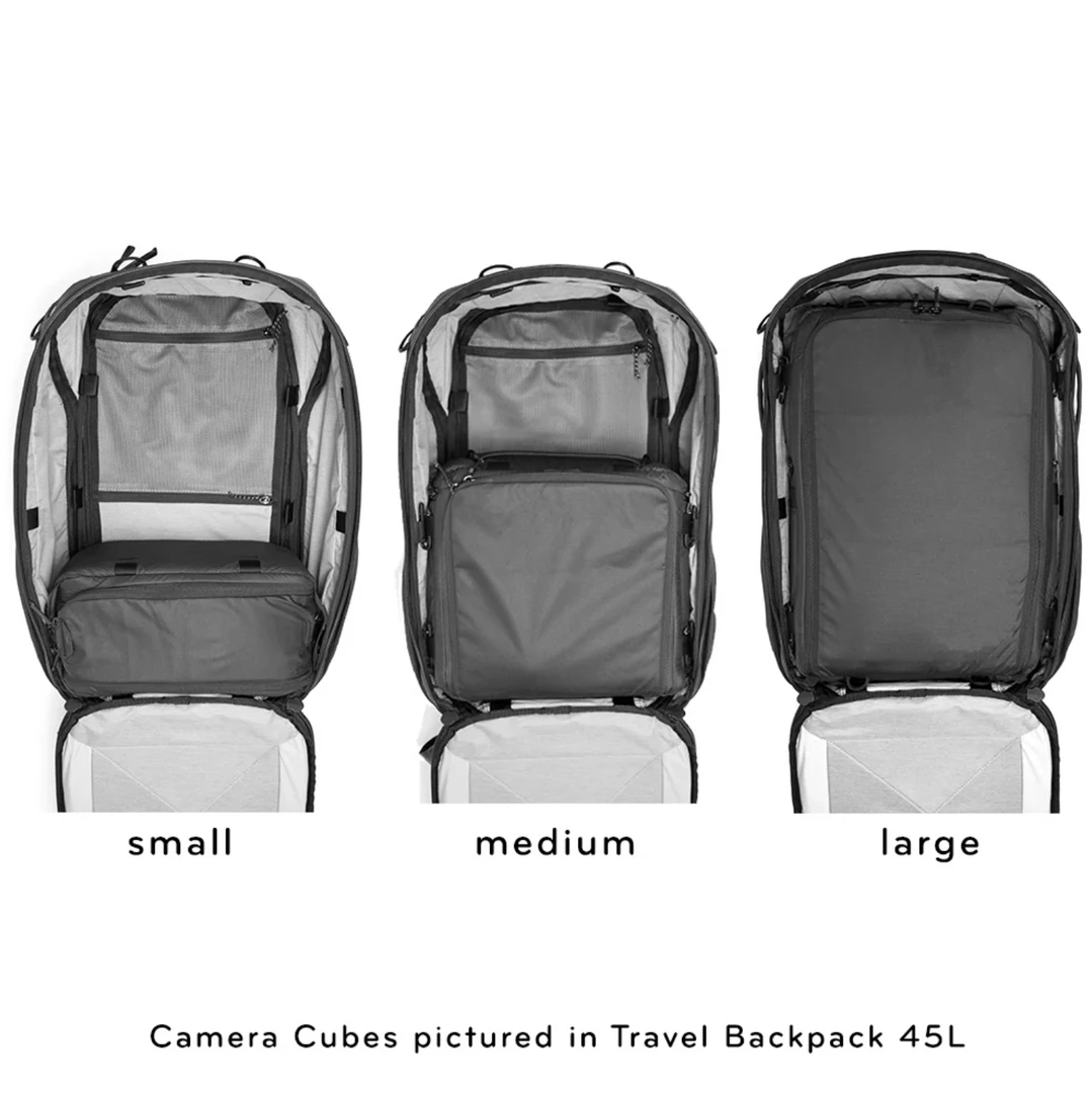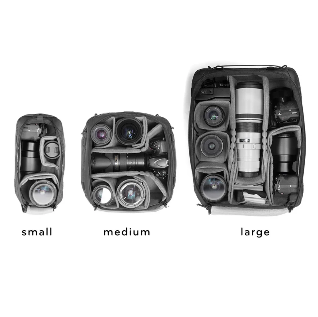 Ultra-protective yet easily accessible, Peak Design Camera Cubes take the pain and hassle out of traveling with photo, video, or drone gear. Designed to mount securely in any Peak Design Travel Bag, Camera Cubes give you custom organization and protection, whether you’re carrying a small mirrorless kit or a full professional creative setup. A range of different protective, low-profile FlexFold dividers give best-in-class customizability. A tear-away main opening has a tuck-away flap for faster access when the cubes are packed in your bag. Medium and Large cubes feature dual side zips, giving you additional access points. Movable pocket for filters, lens caps, and small stuff. A weatherproof recycled 400D nylon canvas shell with high-density foam sub-lining keep your gear safe and sound.