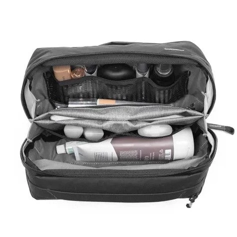 Sits upright on the counter or hangs via a stowable hook, always giving total visibility and access to your toiletries. A network of internal TPU-coated nylon mesh pockets, along with a magnetically-sealed toothbrush pocket, external razor pocket, and internal zippered pouch, keep items organized and clean. All pockets easily turn inside out for quick cleaning.