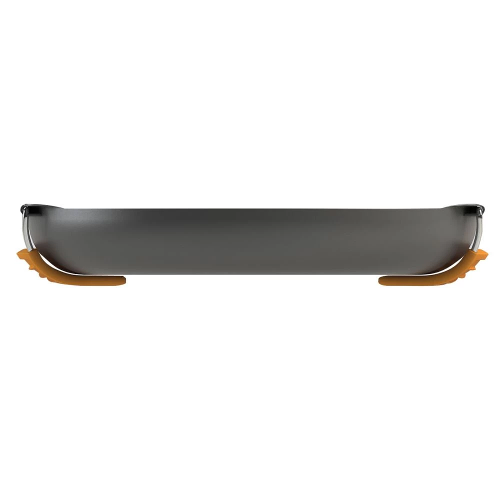 This 8-inch pan is pressed from 5 series aluminum which creates a very light and stiff structure. We’ve further cut the weight down by integrating the handle hinge into a section of the rolled edge and eliminated the rest of the edge that isn’t needed.