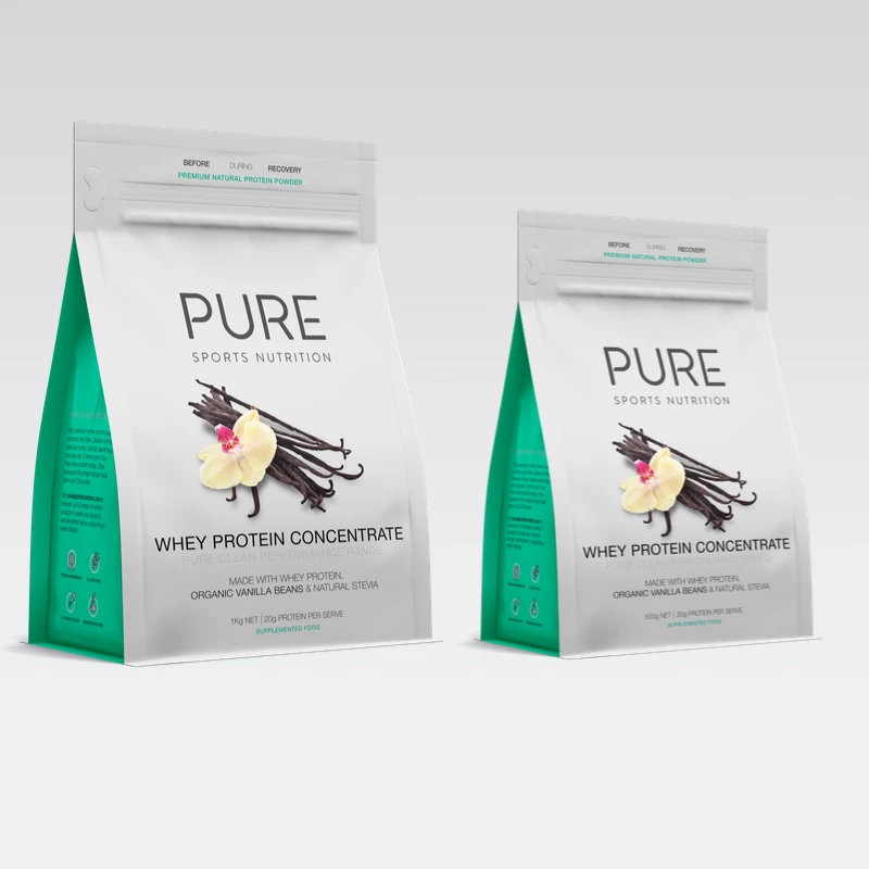 WHEY PROTEIN CONCENTRATE: PURE Whey Protein range uses only a premium quality New Zealand whey protein concentrate (80% protein), made with the milk from grass-fed cows.
