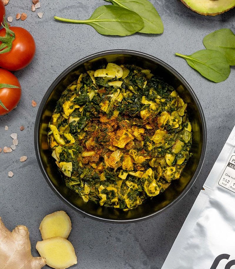- Spinach, Avocado, Tomato [Includes Non-GMO Maize Starch 2.4%], Almonds, Organic Olive Oil, Coconut Milk [Includes Tapioca Based Maltodextrin], Pea Protein Isolate, Ginger, Organic Brown Rice Protein, Cardamom, Coriander Seed, Cumin, Pink Himalayan Salt, Chilli, Turmeric