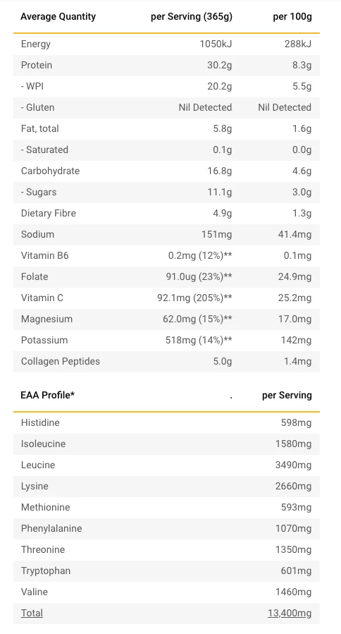 - Banana, Strawberry (32%), Whey Protein Isolate (12%) [Includes Sunflower Lecithin], Spinach, Almonds, Collagen Peptides (3%), Spirulina (1.4%), Organic Acerola, Organic Baobab, Monk Fruit Extract