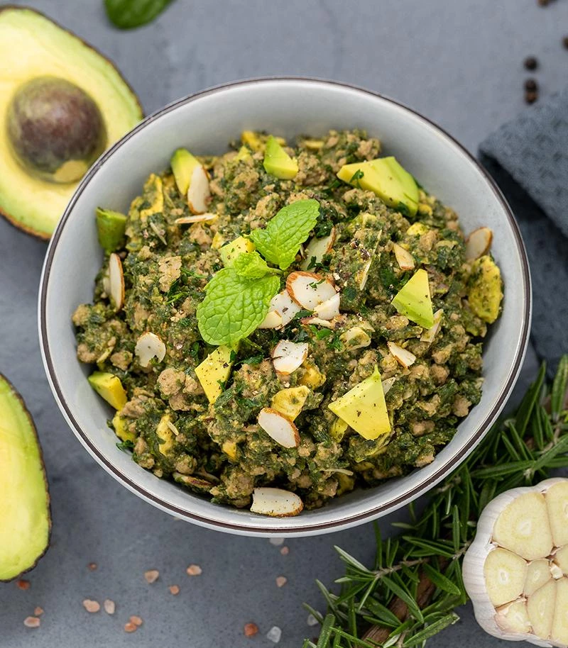 Vibrancy is brought to this meal with bright green pieces of avocado and spinach, milled lamb, visible herbs, and golden sliced almonds within a gravy-like sauce mix.