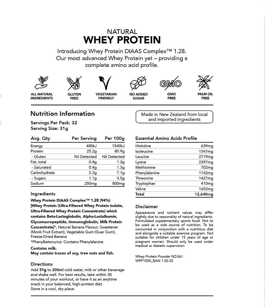 - Whey Protein DIAAS Complexâ„¢ 1.28 (94%) [Whey Protein (Ultra-Filtered Whey Protein Isolate, Ultra-Filtered Whey Protein Concentrate) which contains Beta- Lactoglobulin, Alpha- Lactalbumin, Glycomacropeptide, Immunoglobulin, Milk Protein Concentrate]*, Natural Banana Flavour, Sweetener (Monk Fruit Extract), Vegetable Gum (Guar Gum), Freeze-Dried Banana