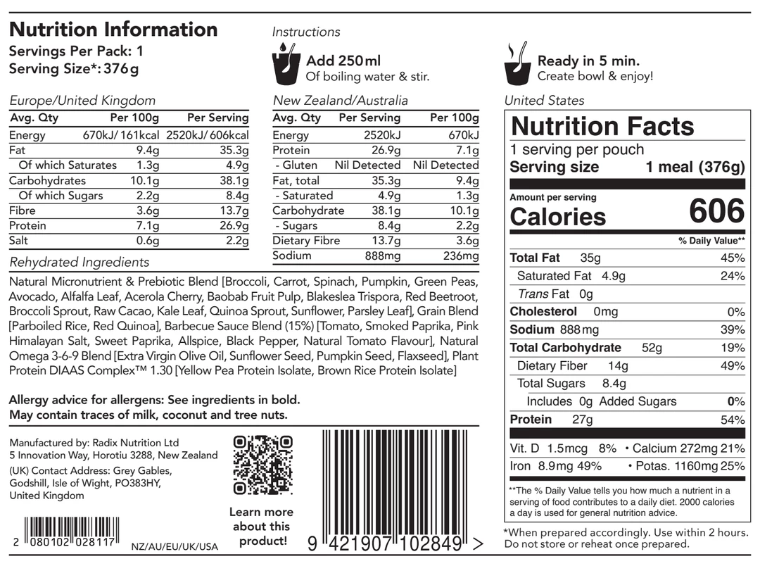 - Prebiotic Vegetable Blend (Broccoli, Carrot, Spinach, Pumpkin, Splited Peas, Avocado), Tomato [Includes Non-GMO Maize Starch 2.4%], White Rice, Extra Virgin Olive Oil, Apple Powder, Sunflower Seeds, Smoked Paprika, Pea Protein Isolate, Brown Rice Protein, Sweet Paprika, Pink Himalayan Salt, Thyme, Allspice, Black Pepper, Chilli