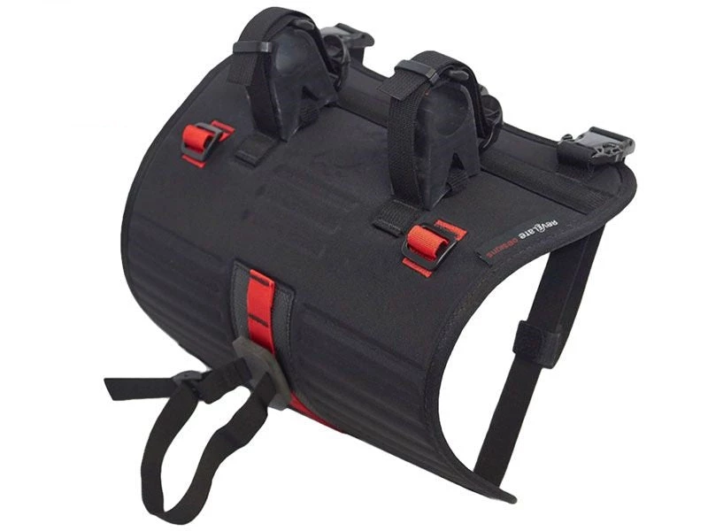 The Harness is a semi-rigid mount designed to carry dry bags, pack-rafts, stuff sacks and other cylindrical shaped objects. Think of it as a “soft rack” for your handlebar, the harness has built in straps that excel at carrying light, bulky loads. Integrate it with any of our front pockets for a highly versatile carrying system.