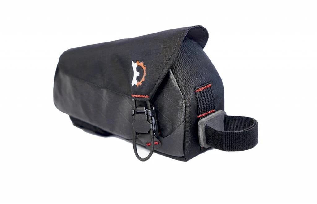 Instead of a zippered opening, access to the bag is by a smartly contoured top flap held in place by a magnetic buckle with mechanical engagement (read – the magnet aids in closure, while load is placed on a connection). It will not unintentionally open and spill your gummy bears when you end up in the trees with your bike upside down like a conventional magnetic closure would. You can easily open the bag one handed by pulling outward on the cord loop and you have access to the whole top of the bag. To close, just flick the flap down and the buckle self-engages!