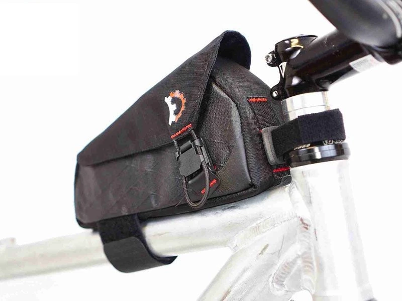 Beefy top tube strap has gripper material with double back wrap for bomber stability