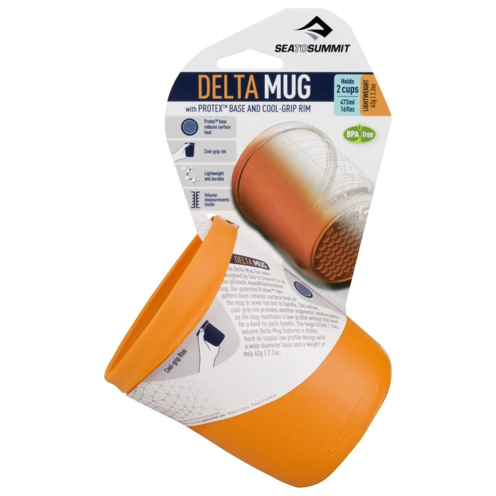 The Delta Mug has been designed by Sea to Summit to be the ultimate expedition and/or outdoor mug. Our patented Protex hex pattern base dissipates heat and reduces the weight to only 62g. The ergonomic rim is heat resistant and comfortable to hold even with hot liquids, meaning a hard to pack handle is not necessary. The food grade, BPA free, Nylon 66 material has an incredible strength to weight ratio, it is resistant to odours and stains and it will not crack in the extreme cold. The large 473mL volume Delta Mug features a stable, low profile hard to topple design with a wide diameter base.