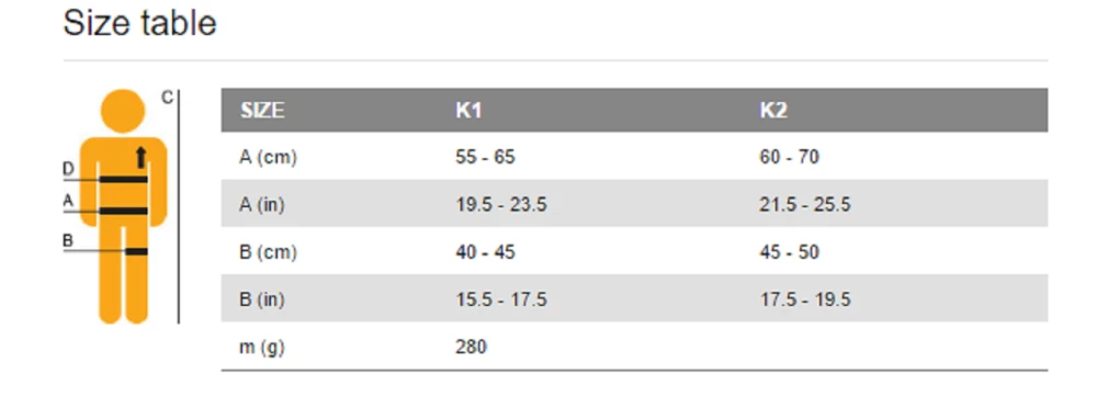 K1 Waist 55cm – 65cm Leg 35cm – 40cm Weight 305g