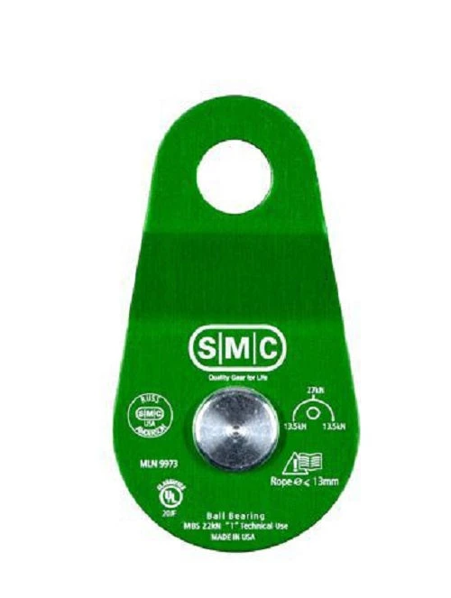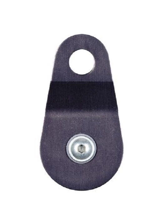 Oilite (sintered bronze) bearings are popular for delivering reliable performance at a reduced cost. Sealed ball bearings provide optimal efficiency and reduce the performance robbing resistance that is inherent in most multiple component systems. In addition, sealed ball bearings are not prone to failure under misaligned loads or with twisted gear as can be the case with needle bearings. The attachment hole is sized to accept large rescue carabiners with sufficient room to allow the carabiner to rotate freely and easily.